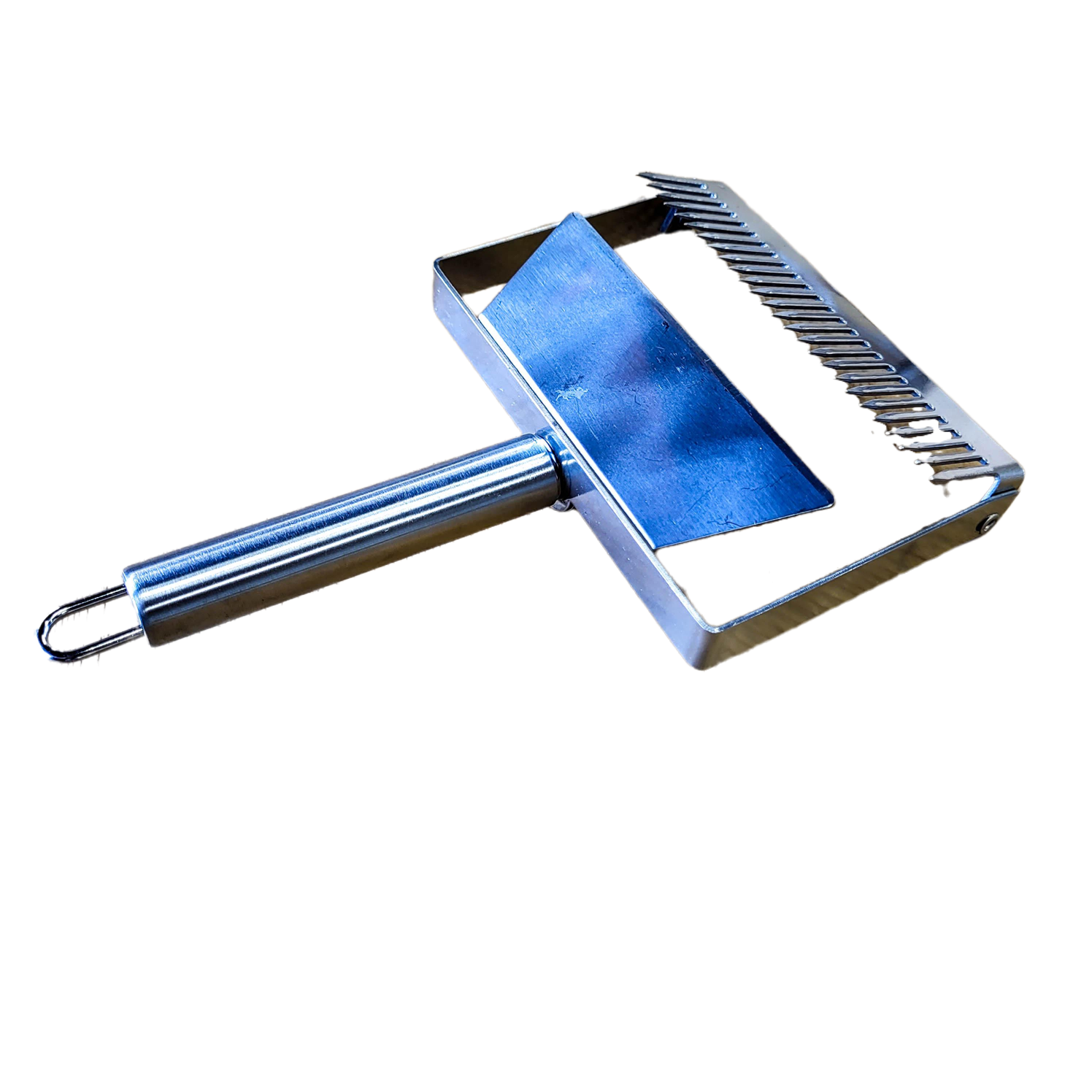 Our manual, wide uncapping plane is made of stainless steel and is used to help with uncapping frames when harvesting honey. The smart design allows you to draw the plan over the honey, removing the cappings as it is pulled. This has become a very popular tool for harvesting honey, along with the normal uncapping fork and knife.